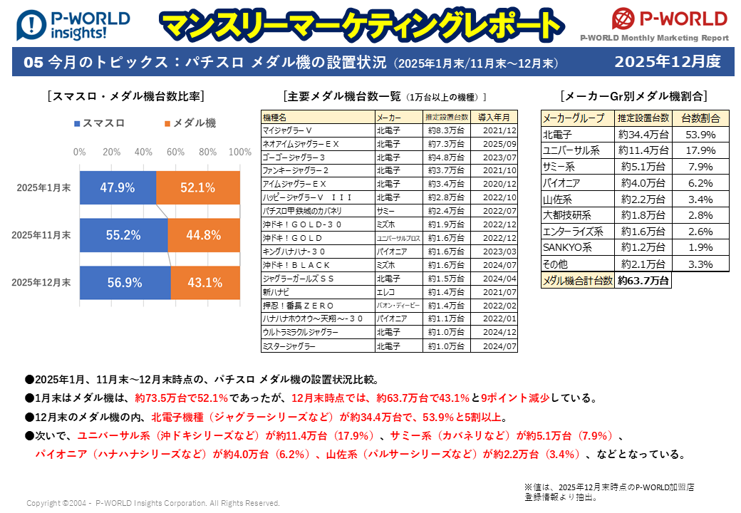 P-WORLDマーケティング・データサービス」やP-WORLD掲載のデータより、パチンコ・パチスロ市場の最新の動向をレポートいたします。
